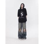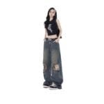 Punk Wash Denim Distressed Straight-leg Trousers Street Fashion Retro