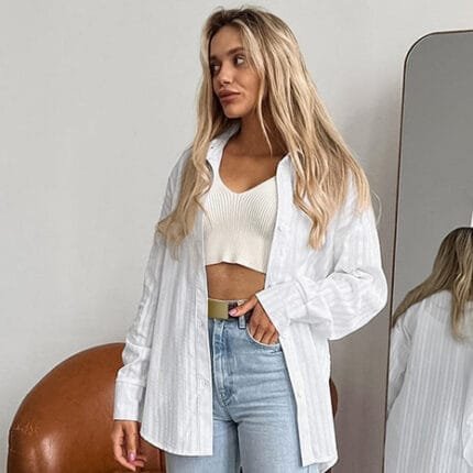 Women’s White Cotton Jacquard Lapel Loose Casual Shirt