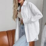 Women’s White Cotton Jacquard Lapel Loose Casual Shirt